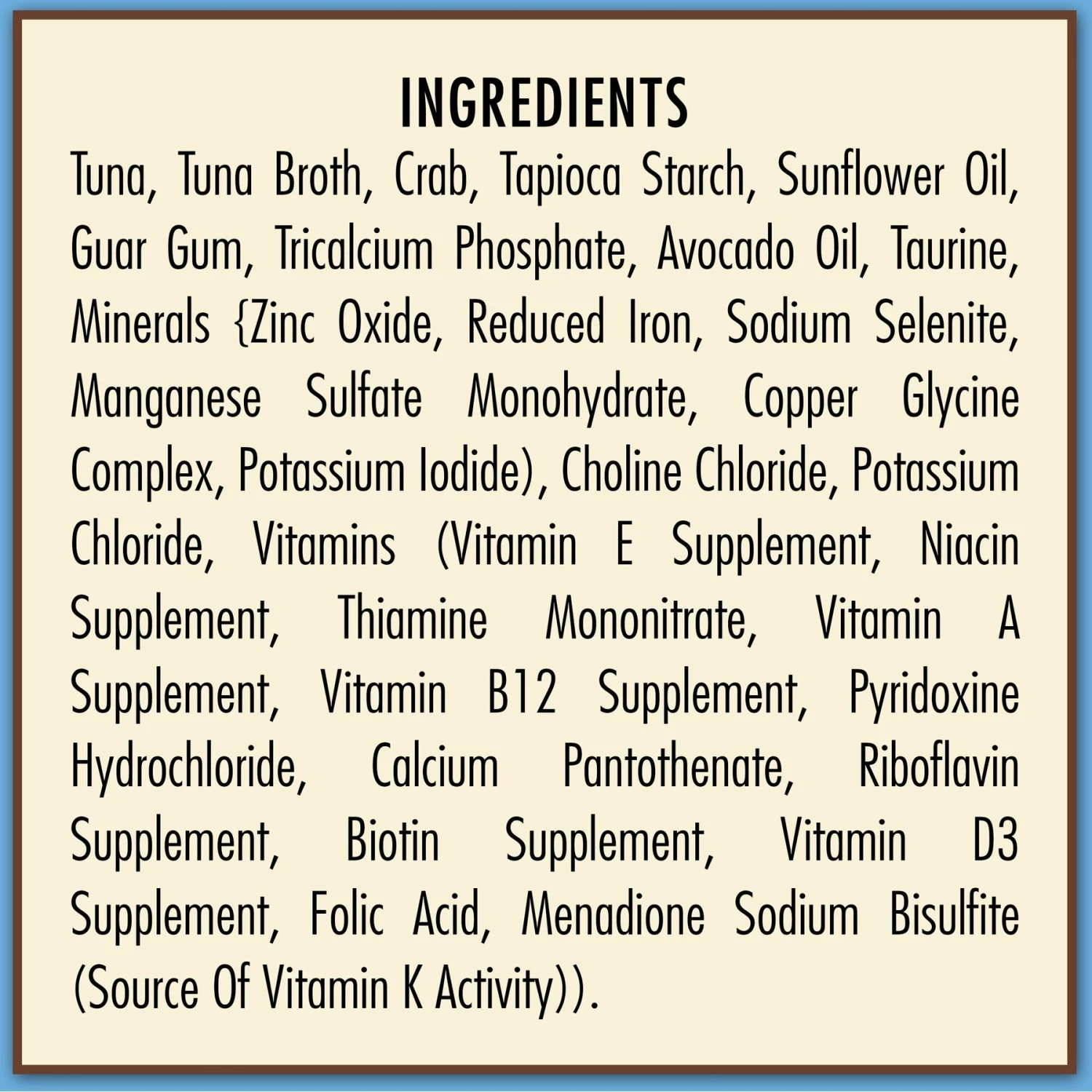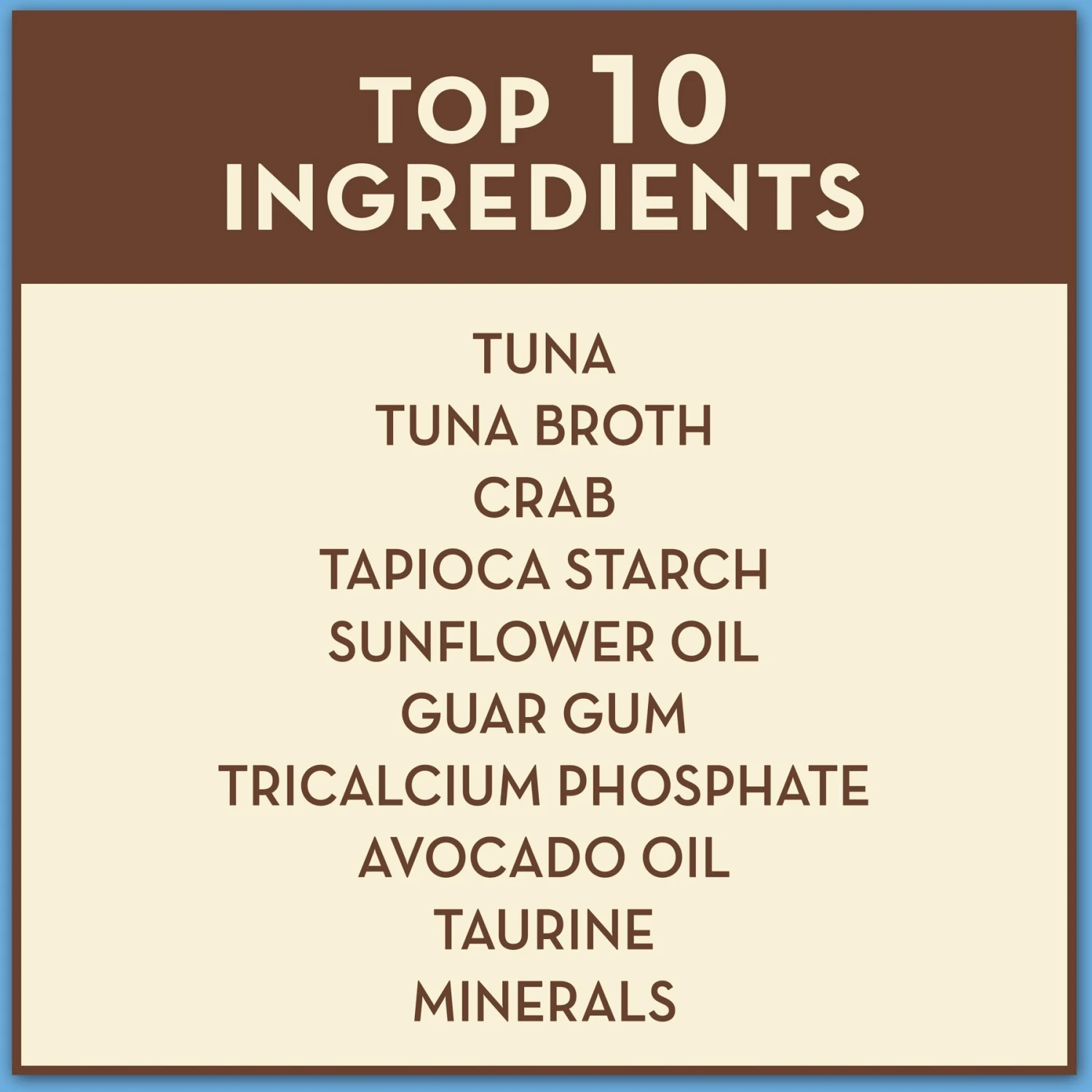 - Tuna and tuna broth are the top ingredients, plus crab for the animal-sourced protein your kitty thrives on.