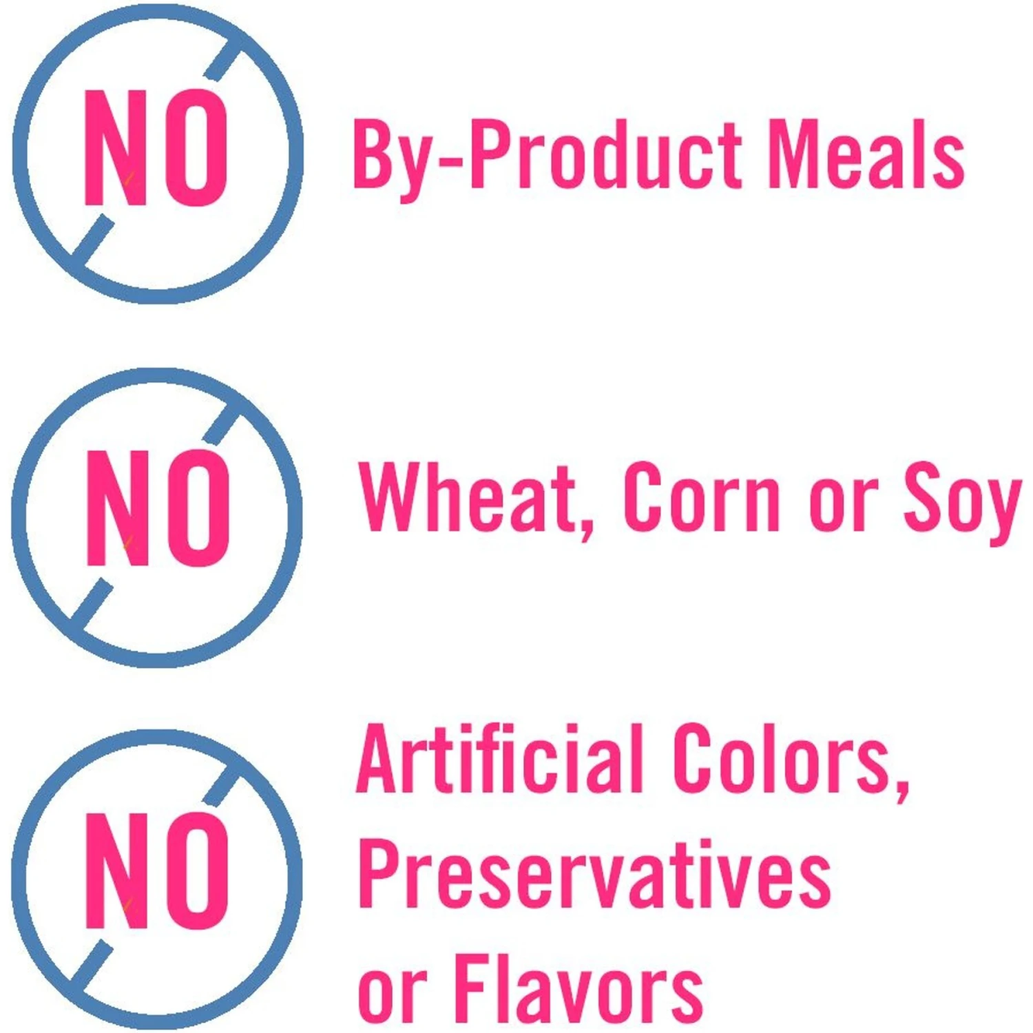 - Free from wheat, corn, soy, by-product meals, and artificial colors, flavors, and preservatives.