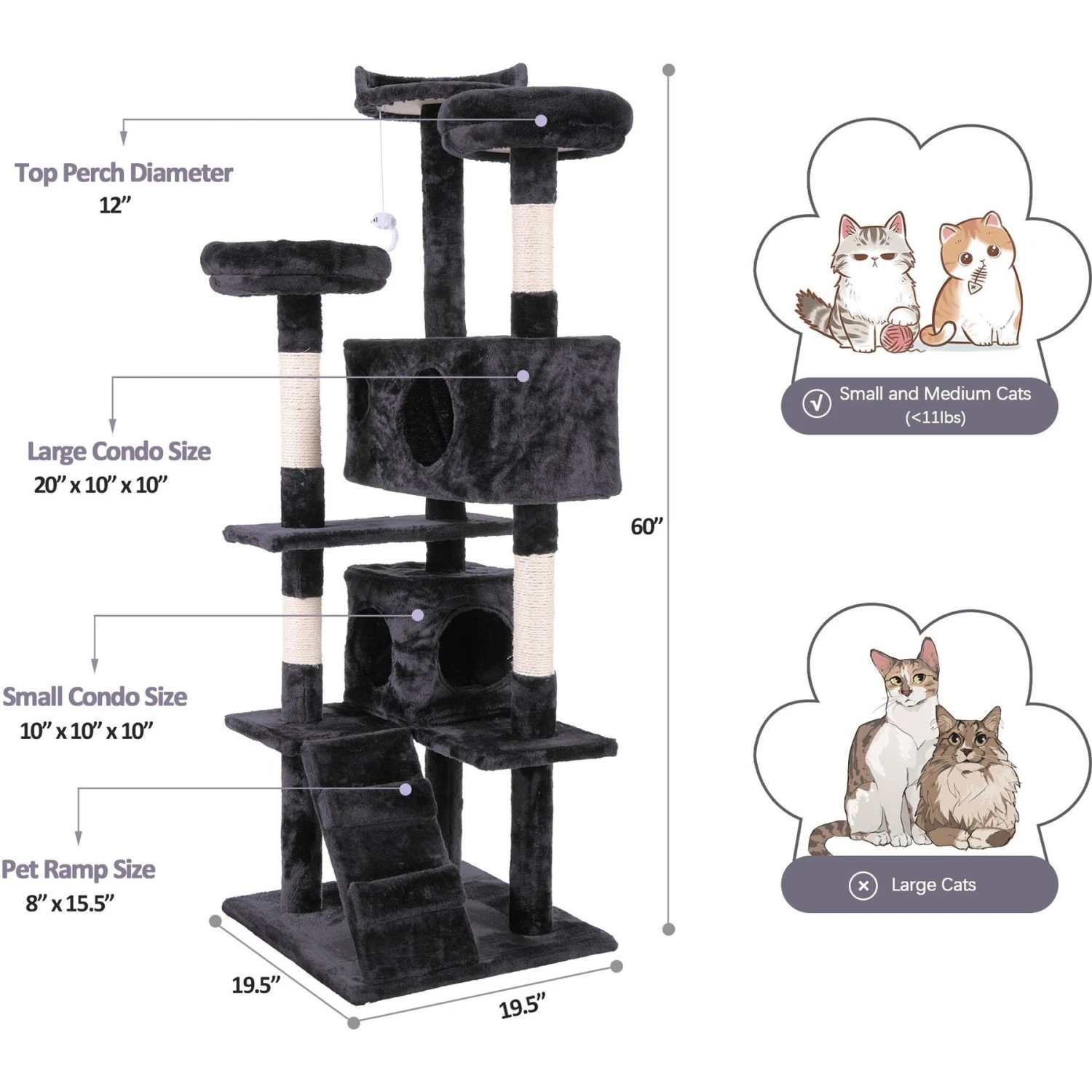- Multi-level activity center features 3 elevated perches, 2 ventilated retreat condos, 4 posts, a bottom ramp for stability and a top dangling toy.