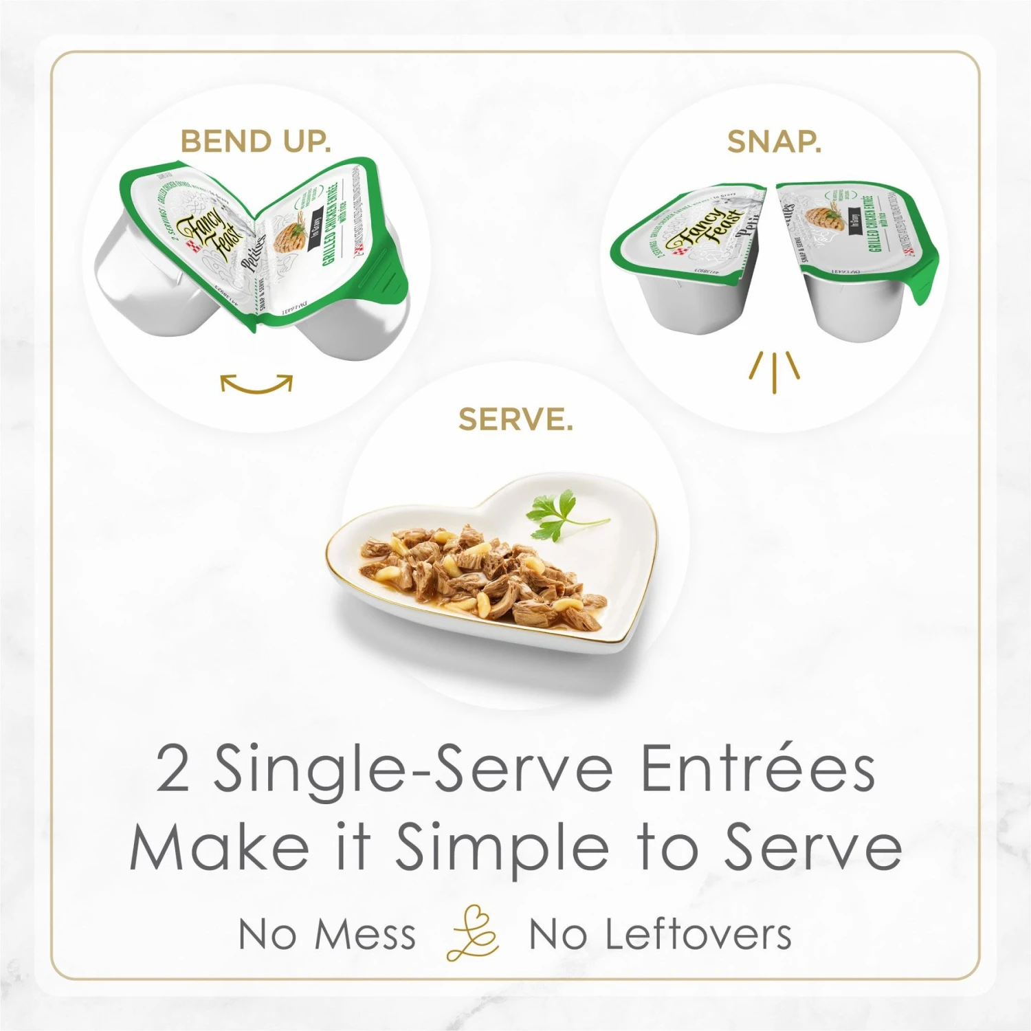 - Fancy Feast wet food for cats twin packs divide into 2 compartments for no mess and no leftovers.
