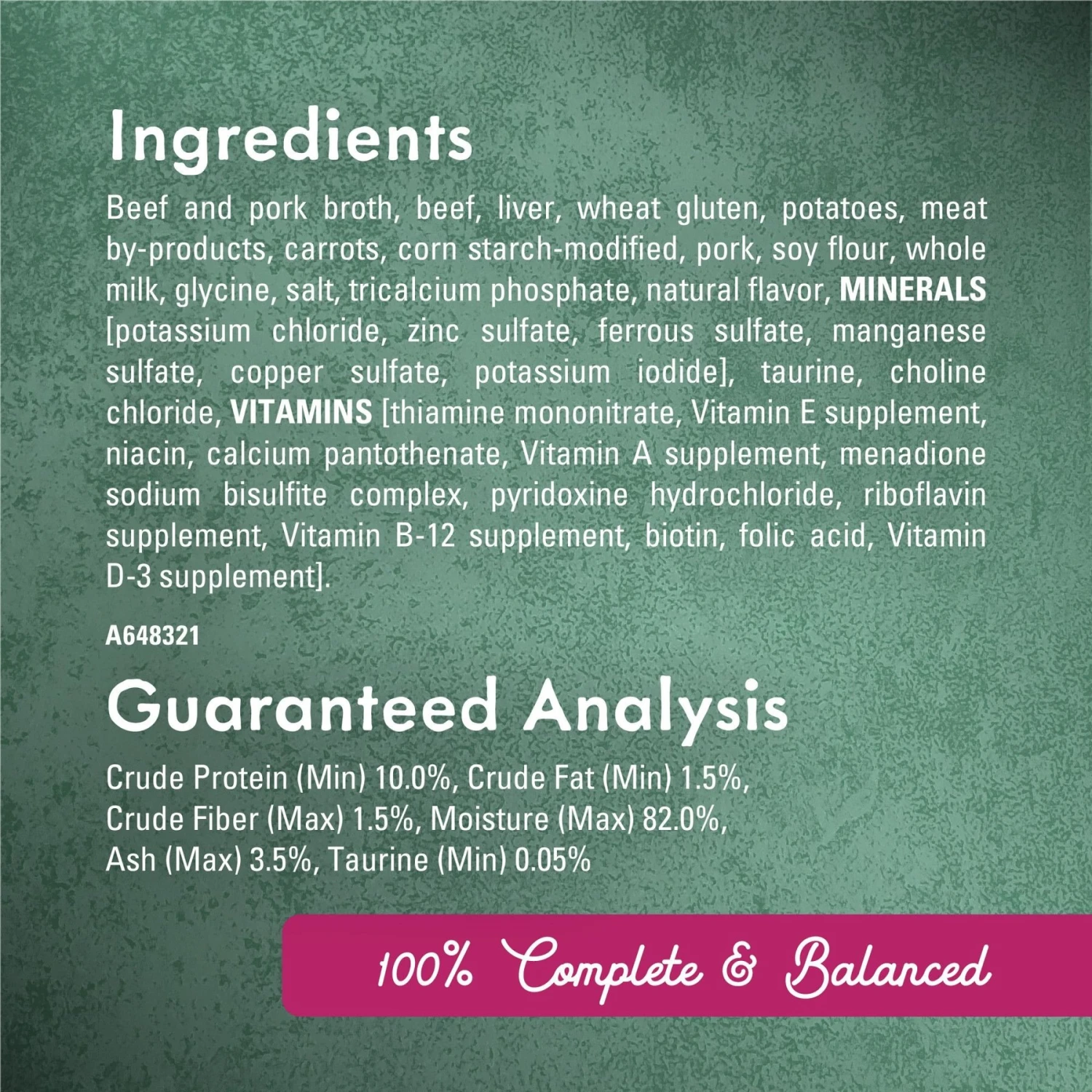 - Beef & Pork Milanese with Carrots and Potatoes in Savory Juices is made without artificial ingredients, colors or preservatives.