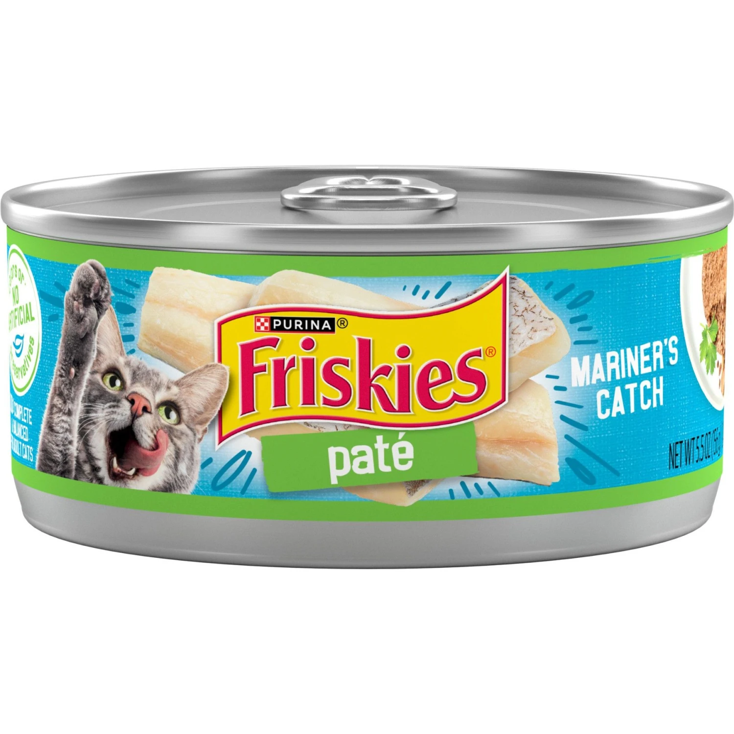 - Purina Friskies Pate Mariner’s Catch with fish cat food recipe tempts your furry friend to her dish with a smooth pate texture sure to thrill her with every last bite.