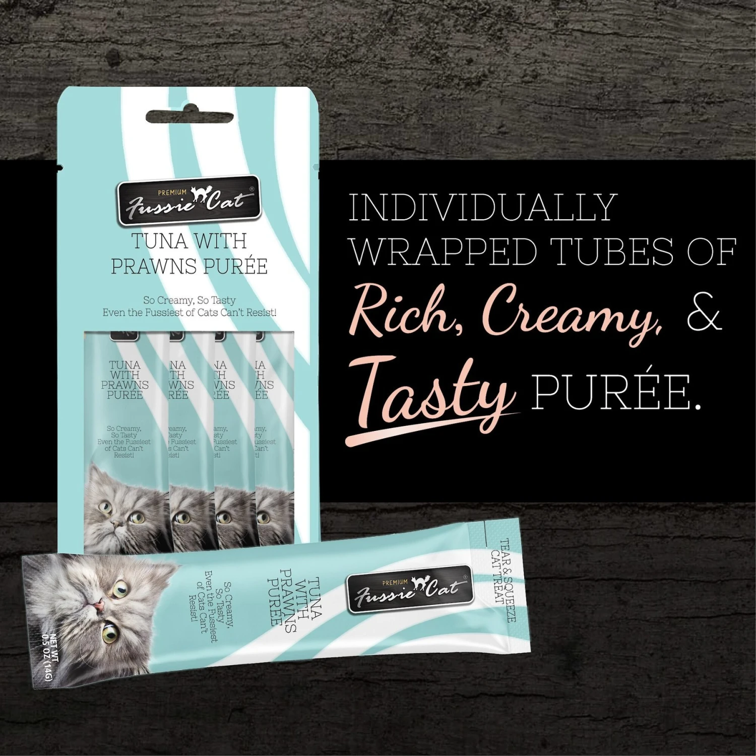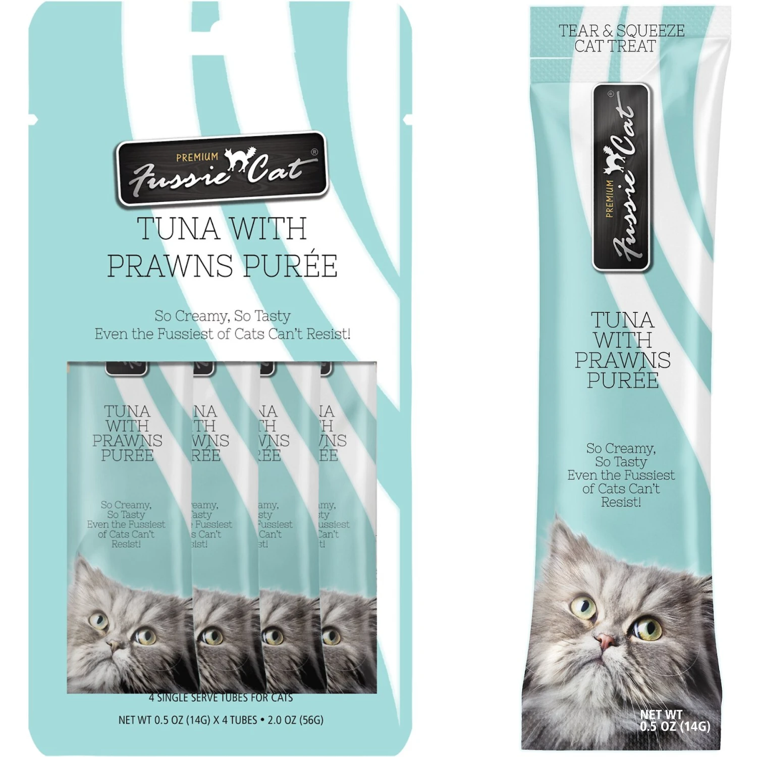 Fussie Cat Tuna With Prawns Puree Lickable Cat Treats, 0.5-oz Pouch, Pack Of 4