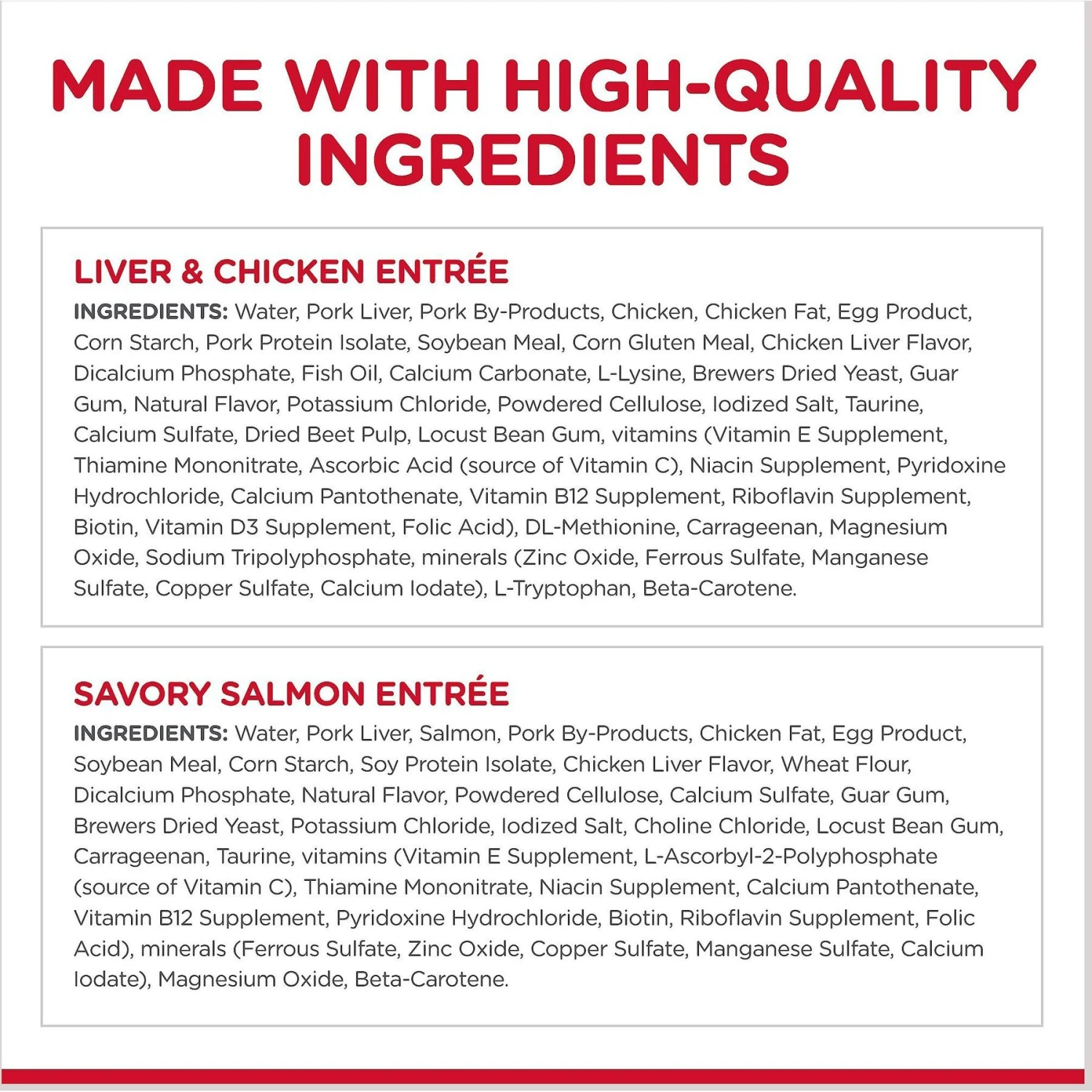 - Variety pack includes (6) cans of Hill’s Science Diet Liver & Chicken Entrée and (6) cans of Hill’s Science Diet Savory Salmon Entrée wet cat food.