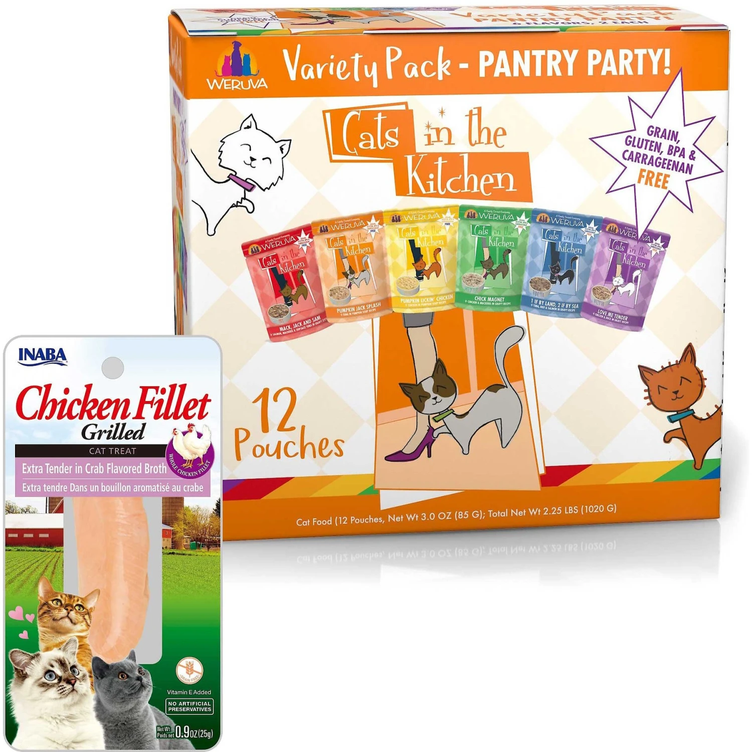 Inaba Extra Tender Grilled Chicken Fillet In Crab Flavored Broth Grain-Free Cat Treat & Weruva Cats In The Kitchen Pantry Party Variety Pack Grain-Free Cat Food, 3-oz Pouch, Case Of 12