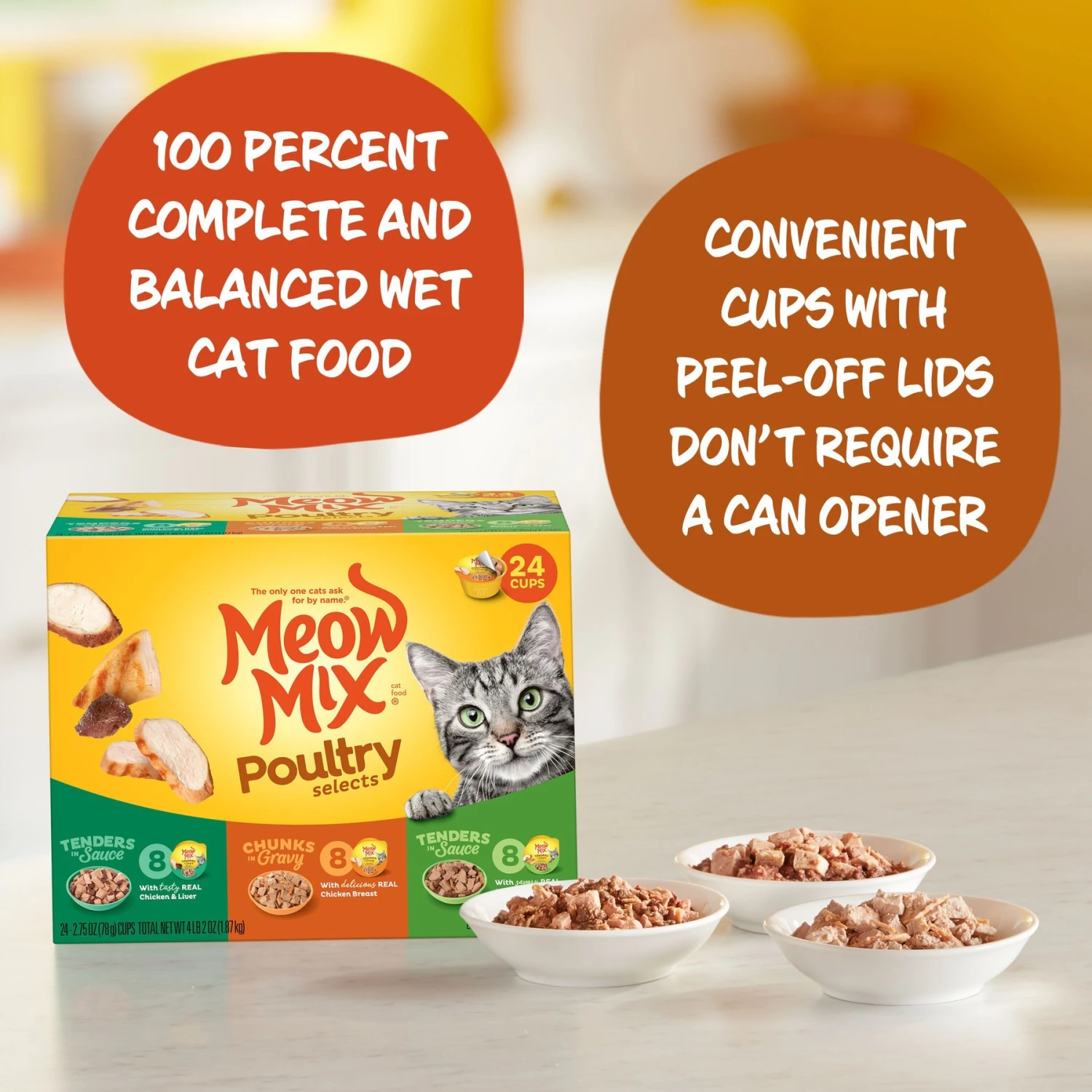 - Convenient cups with peel-off lids don’t require a can opener.