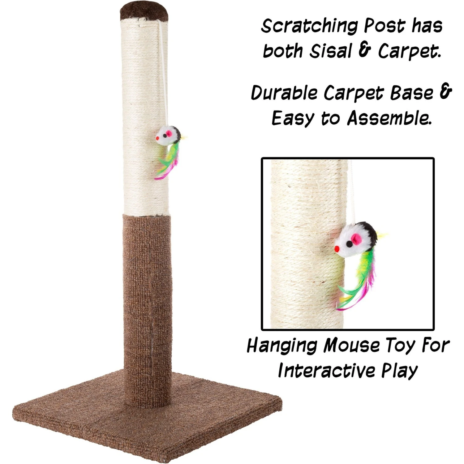 - Carpet and sisal rope offer a variety of textures to capture your kitty’s interest.