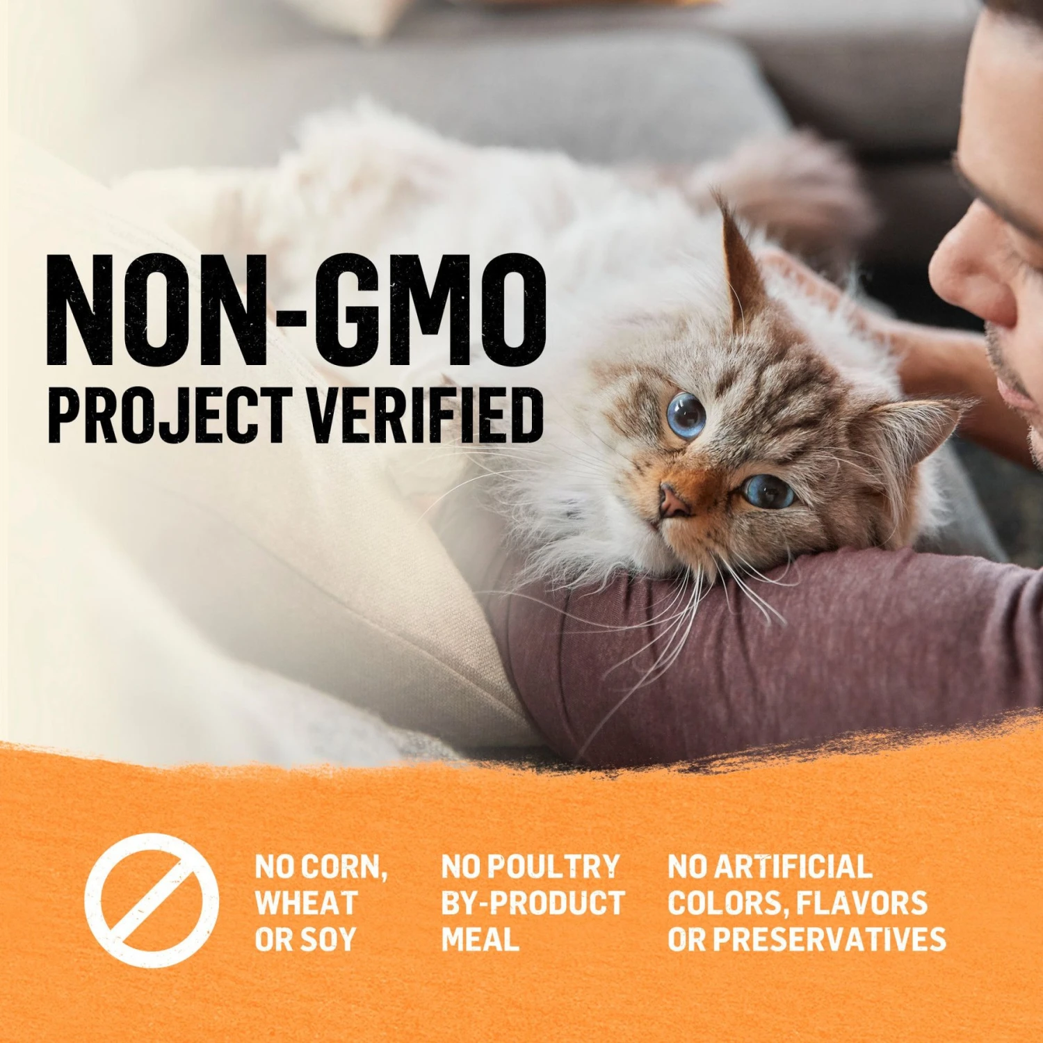 - This Non-GMO Project Verified, organic dry cat food recipe has no corn, wheat, soy or poultry by-product meal, nourishing your furry BFF with the same wholesome ingredients you choose for yourself.