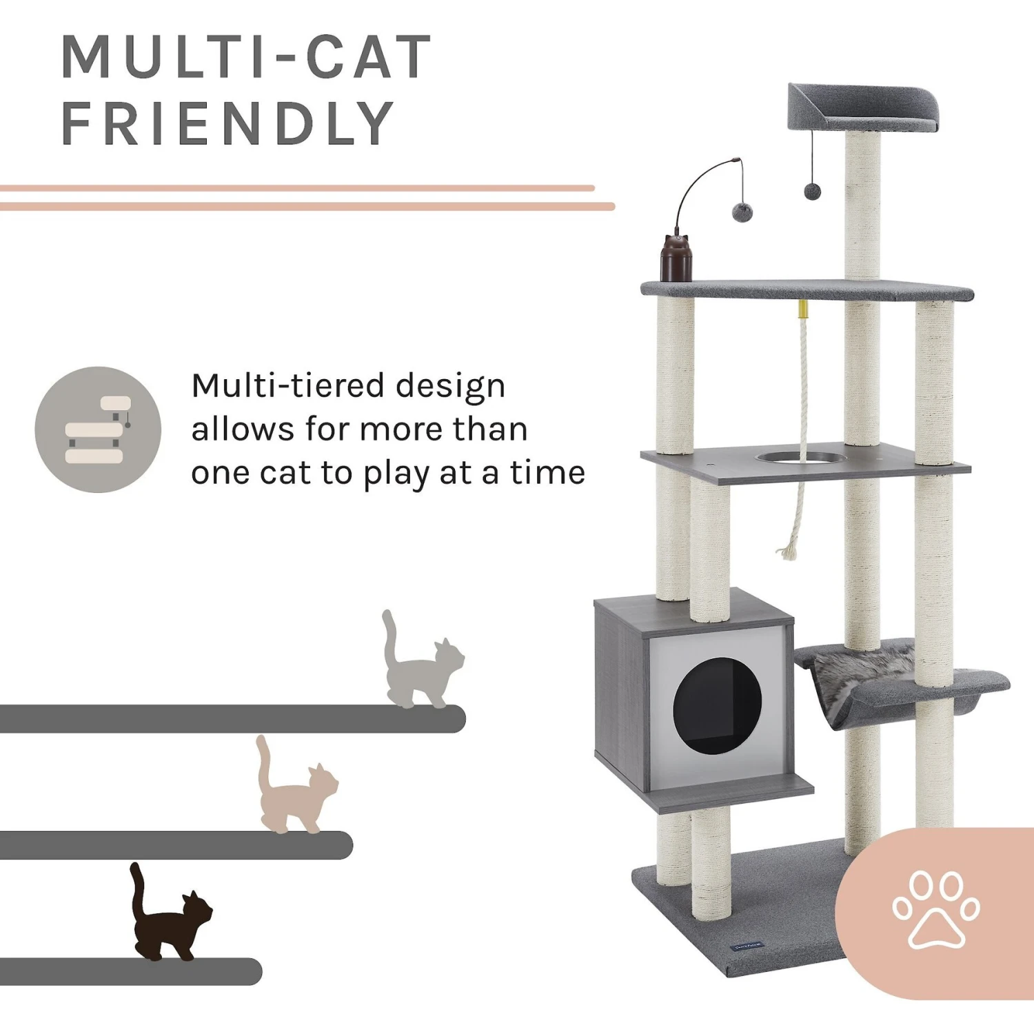- The multi-tiered design can comfortably support multiple cat companions at once!