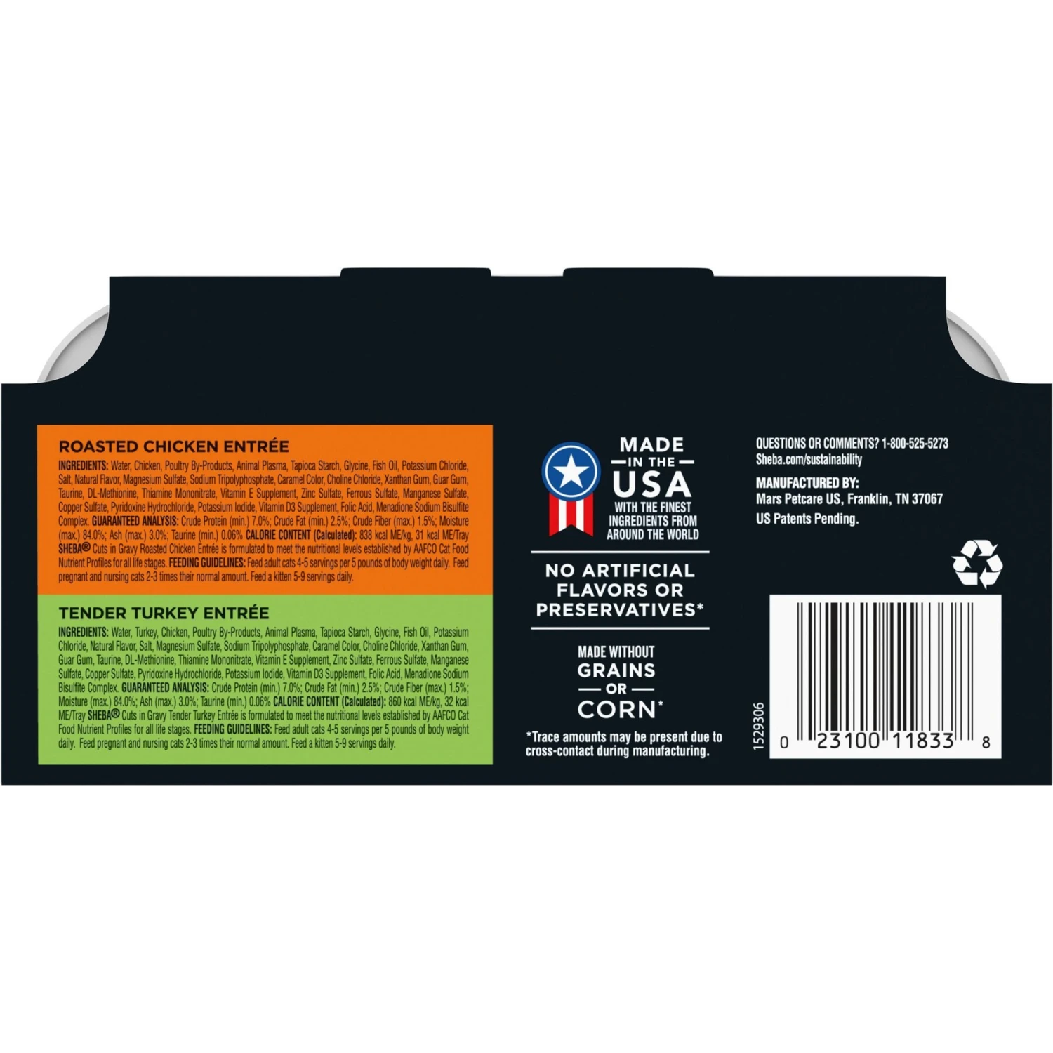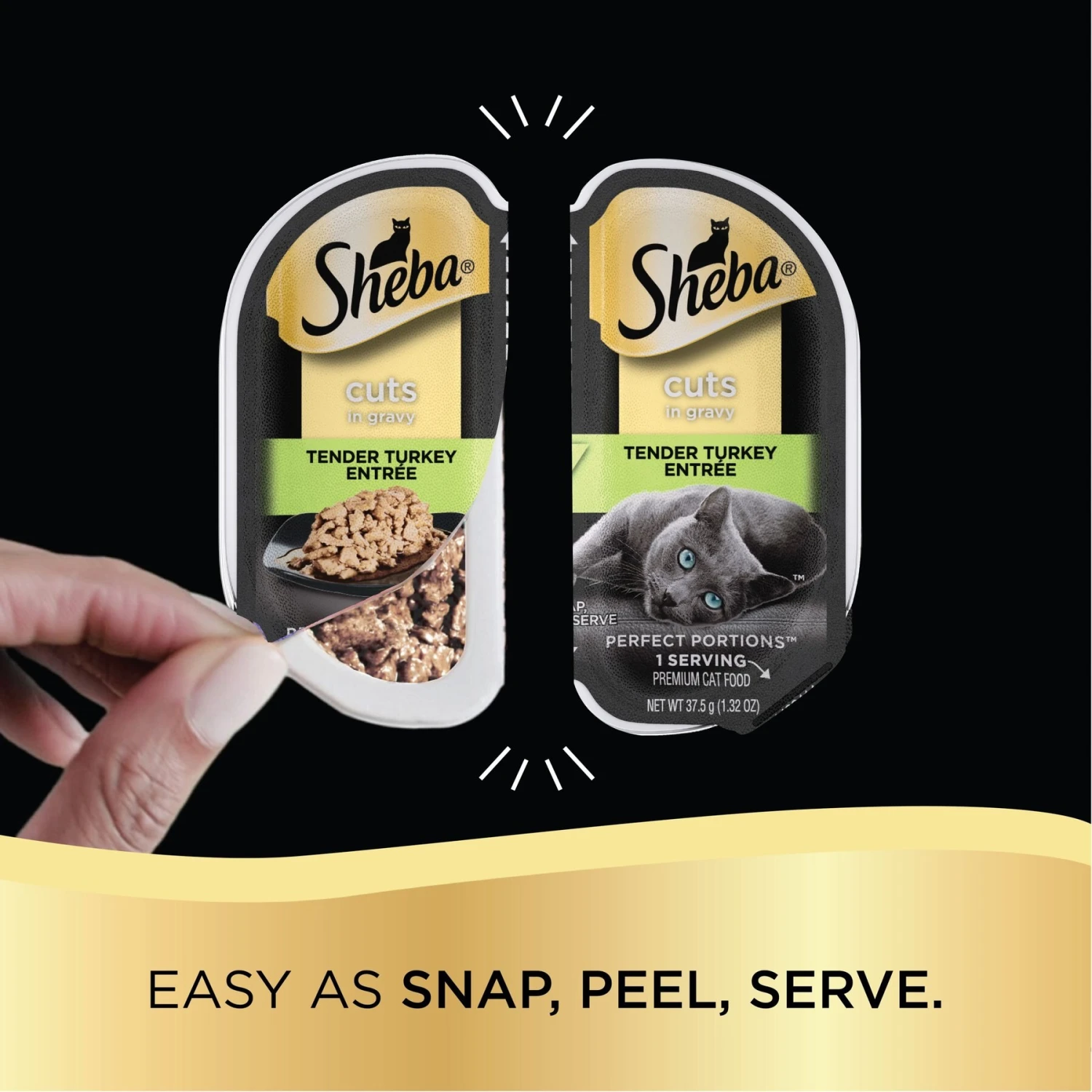 - Each twin pack contains two 1.32-ounce servings of chicken or turkey in gravy, in individual trays that snap and peel open easily.