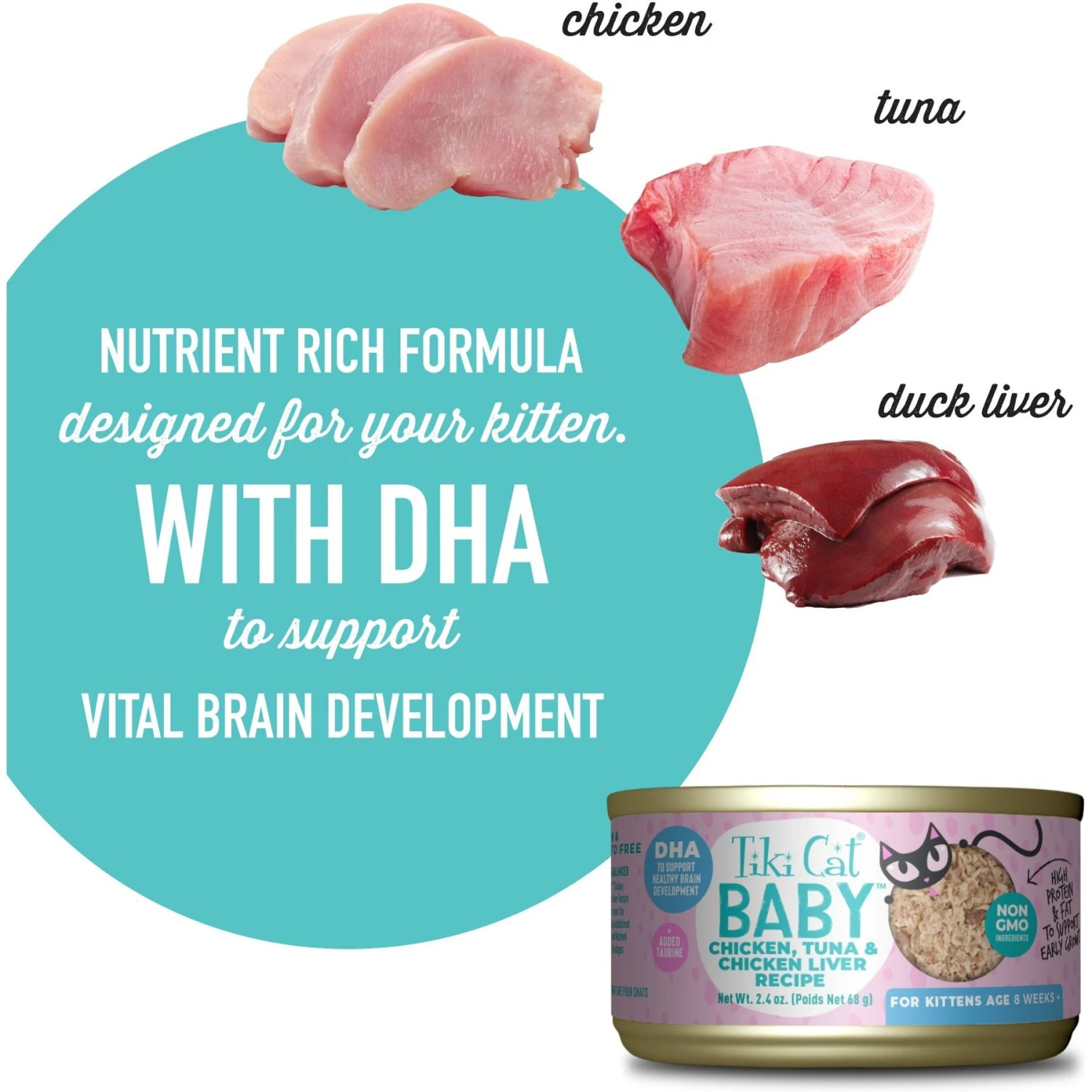 Tiki Cat Baby Chicken, Tuna, & Chicken Liver Shreds Grain-Free Wet Cat Food, 2.4-oz Can, Case Of 12