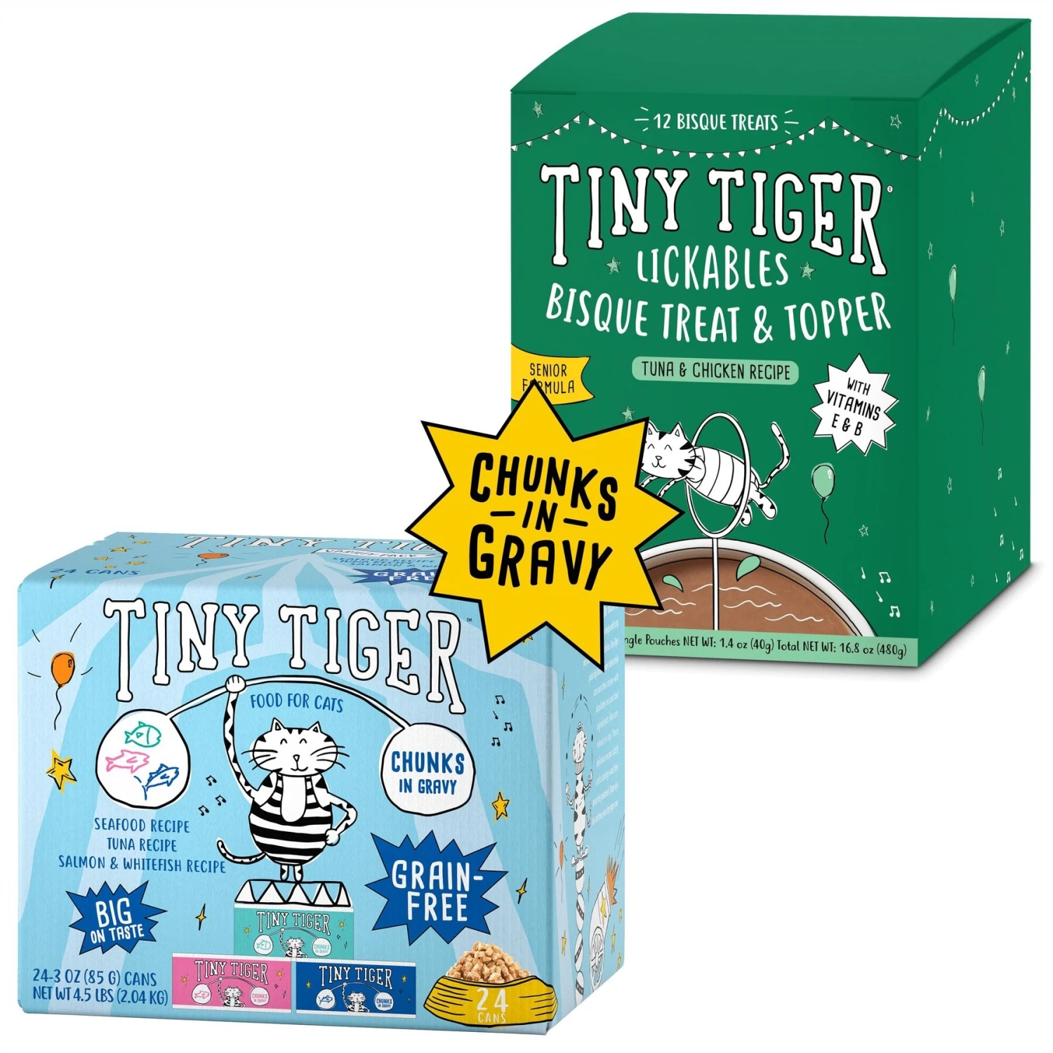 Tiny Tiger Chunks In Gravy Seafood Recipes Variety Pack Grain-Free Canned Cat Food & Tiny Tiger Lickables, Senior Formula, Tuna & Chicken Recipe, Bisque Cat Treat & Topper