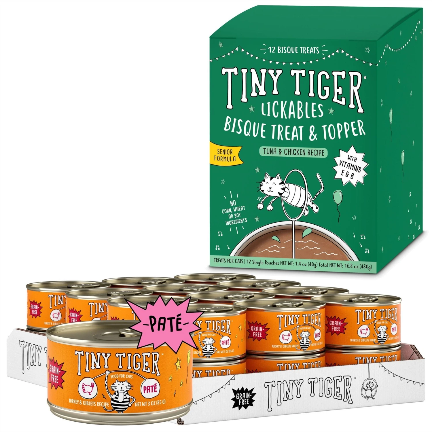 Tiny Tiger Pate Turkey & Giblets Recipe Grain-Free Canned Cat Food & Tiny Tiger Lickables, Senior Formula, Tuna & Chicken Recipe, Bisque Cat Treat & Topper