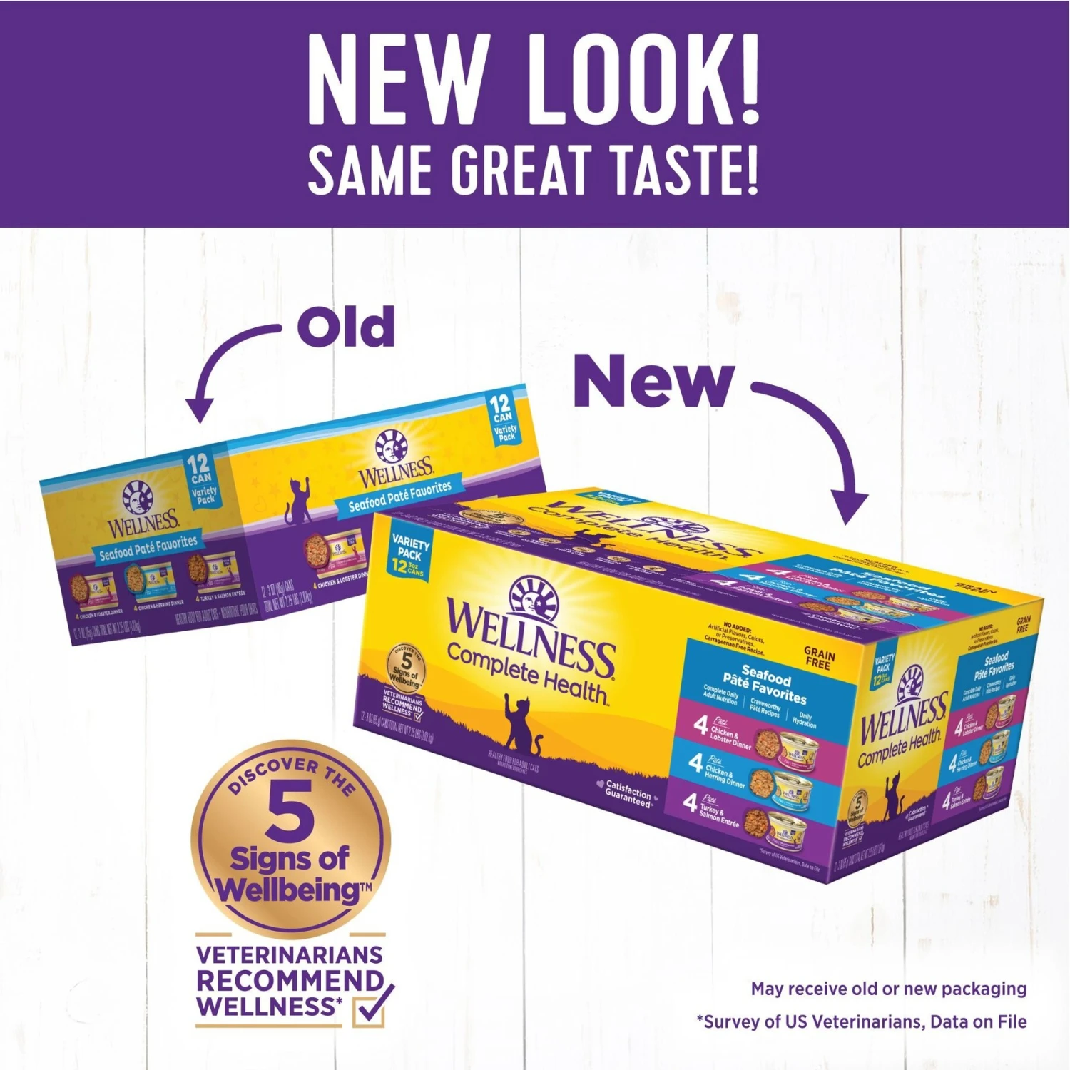 Wellness Complete Health Seafood Pate Favorites Variety Pack Grain-Free Wet Cat Food, 3-oz Can, Case Of 12