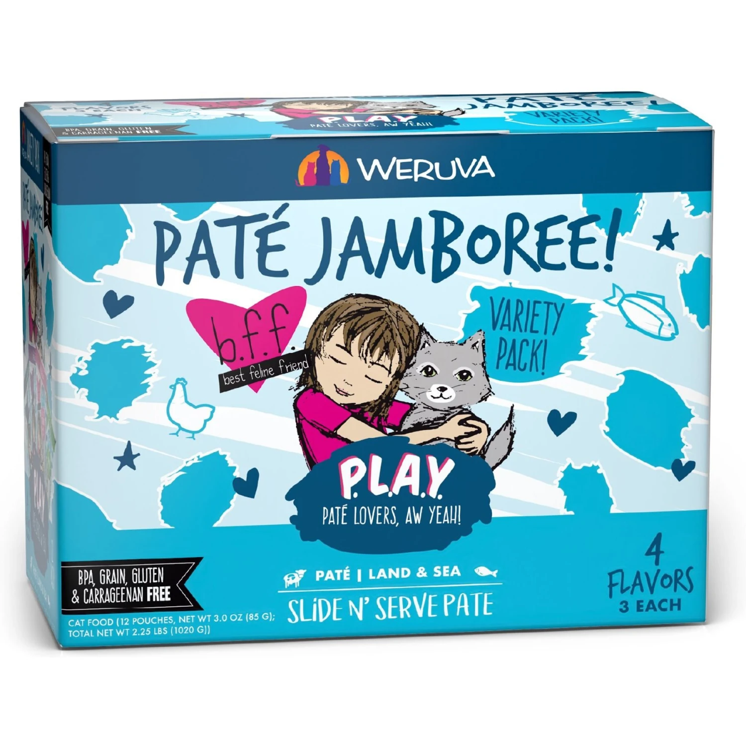 Weruva Best Feline Friend Paté Lovers, Aw Yeah! Paté Jamboree! Variety Pack Grain-Free Wet Cat Food, 2.8-oz Pouch, Case Of 12 & BFF Play Pate Lovers Pate Partay Variety Pack Wet Cat Food, 3-oz Pouch, Pack Of 12