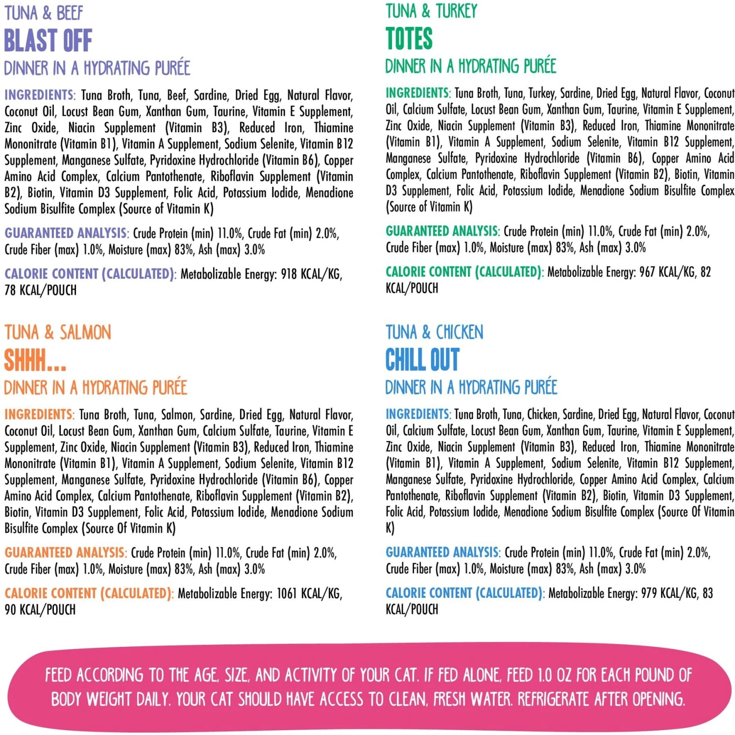 - Includes 3 packs each of Tuna & Chicken Chill Out, Tuna & Salmon Shhh…, Tuna & Beef Blast Off! and Tuna & Turkey Totes!—each recipe pureed into a mouth-watering, indulgent pate.
