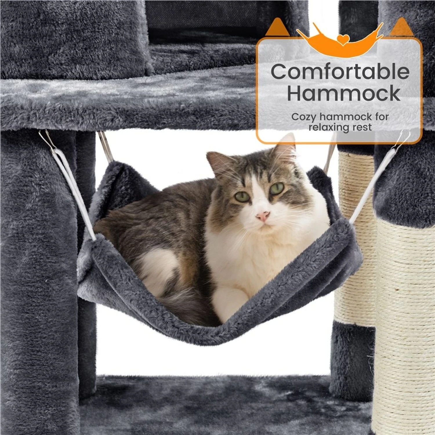 - Features two top plush perches, two roomy cat apartments, plus hammock and basket lounging areas for rest and play.